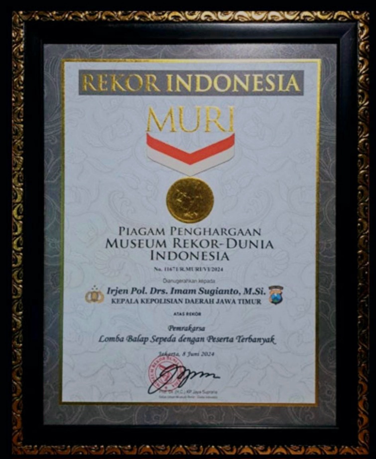 SURABAYA, radarpenanews.com – Polda Jawa Timur meraih penghargaan dari Museum Rekor Indonesia (MURI) atas rekor pemrakarsa lomba balap sepeda dengan peserta terbanyak.
