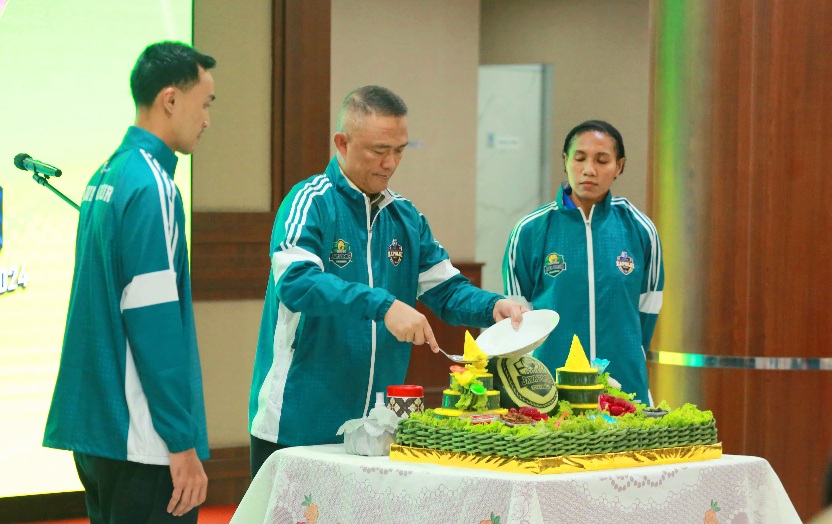 Sebelum memberangkatkan tim bola voli Polda Jatim, Kapolda Jatim memberikan jaket kepada masing masing kapten tim bola voli putra dan putri dilanjutkan pemotongan tumpeng.