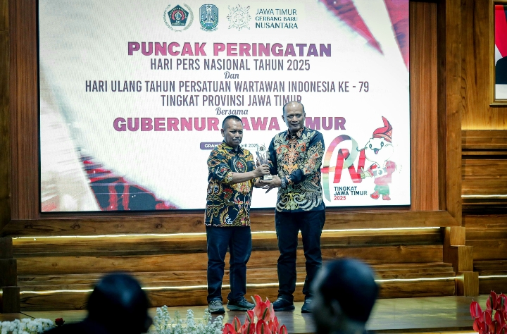 Penghargaan tersebut diserahkan langsung oleh Ketua PWI Jatim Lutfil Hakim kepada Kapolda Jatim, Irjen Pol Nanang Avianto.