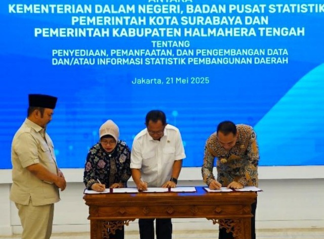 JAKARTA, radarpenanews.com – Pemerintah Kota Surabaya kembali menunjukkan komitmen kuat dalam mewujudkan tata kelola pemerintahan yang berbasis data akurat dan terpercaya. Komitmen ini diwujudkan melalui penandatanganan nota kesepahaman (MoU) trilateral antara Pemerintah Kota Surabaya, Kementerian Dalam Negeri (Kemendagri), dan Badan Pusat Statistik (BPS) yang dilangsungkan di Kantor Badan Perencanaan Pembangunan Nasional (Bappenas), Jakarta, pada Rabu (21/5/2025).