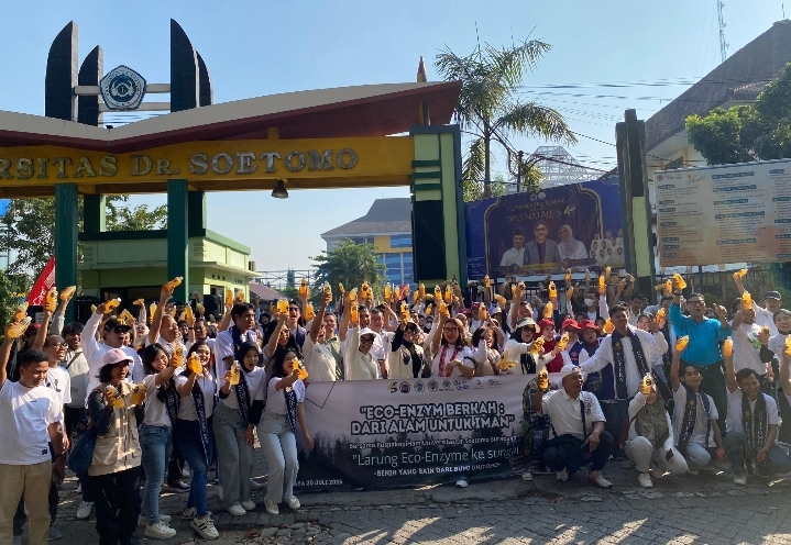 SURABAYA, radarpenanews.com – Dalam rangka memperingati Dies Natalis ke-44, Universitas Dr. Soetomo (Unitomo) Surabaya menggelar serangkaian kegiatan bertema lingkungan, kesehatan, dan edukasi keluarga pada Minggu (20/07/2025). Salah satu agenda utama yang menyita perhatian adalah kegiatan Jalan Sehat dan Larung Eco Enzyme yang melibatkan sivitas akademika, mitra komunitas, dan masyarakat umum di sekitar kampus.