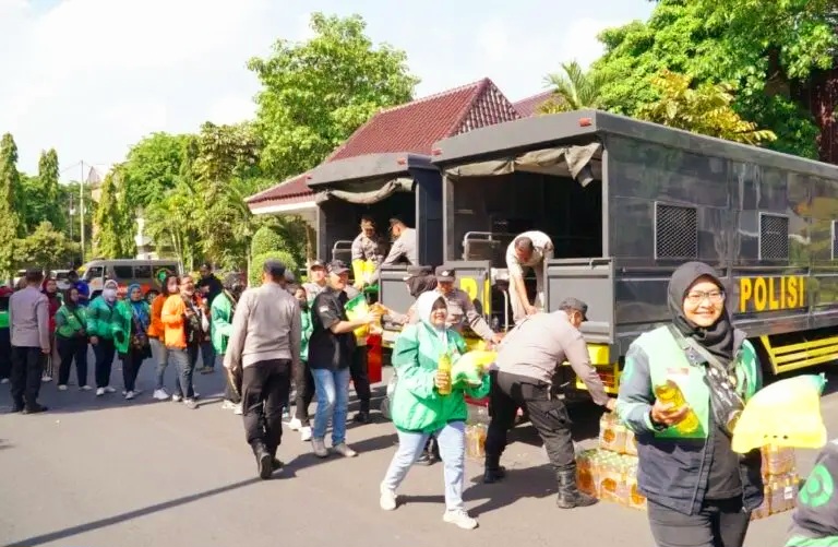 Pada kegiatan ini, Polda Jatim menyalurkan 1.050 paket beras SPHP masing-masing seberat 5 kilogram dan 1.000 liter minyak goreng merk Kita.